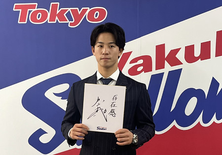 ヤクルトの内山は2倍の4400万円でサインした。5年目で初めて規定打席に到達し、打率2割6分2厘、8本塁打、48打点。(金額は推定)=11日、東京都港区 【時事通信社】