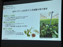 青木さんは、同会と連携して、これまで多彩な方法で「えどがわメティ」について研究。インタビュー調査では、区内でインド(ネパールなども含む)料理などを提供する飲食店では認知度は低いものの、新鮮な生のメティに対する需要は大きく、特に品質を重視していることを明らからにした。また、日本人の高い受容性があること、さらには小松菜との併用でうまみを感じやすくなる層が多いことも示した。機器を使った味覚分析で、懸念されていた苦みも小松菜と同程度にとどまること、栄養成分分析では、「低カロリー・低脂質でありながら、高栄養価であることが分かった」と報告した。