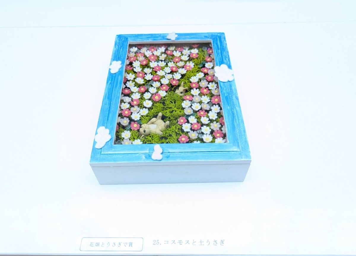 白い城に見立てた「サクラダファミリアに行きたい!」、淡い色の部屋に一冊の本が置かれた「ミュージックボックス」など、個性豊かな作品に、それぞれ日比野さんが「白いお城賞」「本の部屋賞」などの賞名を付ける。花畑で楽しそうに戯れるウサギを表現する「コスモスと土うさぎ」や、絵の具ラベルに日付を付けて、それぞれの色に17年の思い出を重ねた「色の記憶」などの作品も。