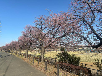 江戸川河川敷堤防天端には、約130メートルに河津桜が連なるように植えられている。同区では、平井の旧中川河川敷や葛西臨海公園、なぎさ公園が広く知られているが、江戸川を渡る総武線と合わせた撮影も楽しむことができる同エリアでも、2月23日現在、六~七分咲きの桜鑑賞を楽しめる。