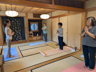本棟(ほんむね)造りの古民家「甲和郷(こうわごう)」(江戸川区南小岩2)で10月9日朝、庭園を眺めながら体をほぐす「シニアヨガ」が開かれた。