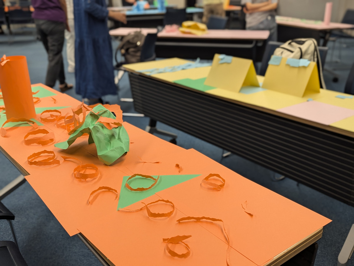 日比野さんは参加者に「中秋の名月の庭」というヒントを投げかけた。1つとして同じものはない色とりどりの画用紙の庭が、展開された。