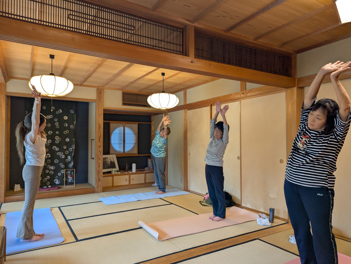 本棟(ほんむね)造りの古民家「甲和郷(こうわごう)」(江戸川区南小岩2)で10月9日朝、庭園を眺めながら体をほぐす「シニアヨガ」が開かれた。