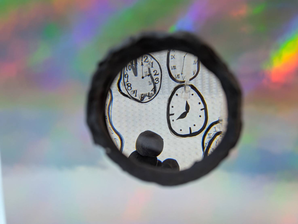 作品リストより「58.充電中 時計は全て私の毎日に関わる時刻です。膝をかかえて座る疲れ果てた人間(私)が充電しているところです。」