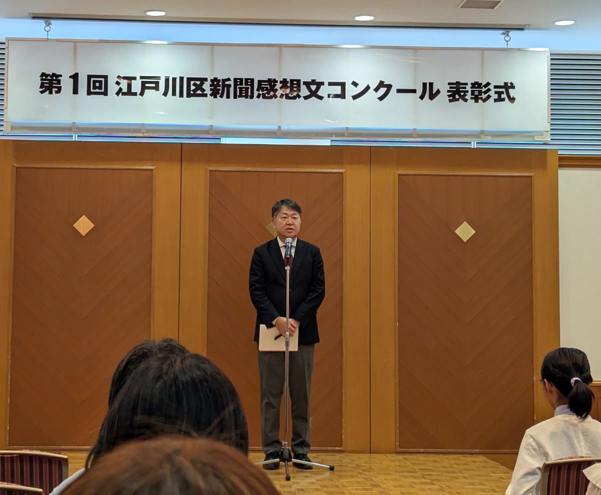 「第1回江戸川区小中学校新聞感想文コンクール」の表彰式が12月6日、グリーンパレス(江戸川区松島1)で行われた。