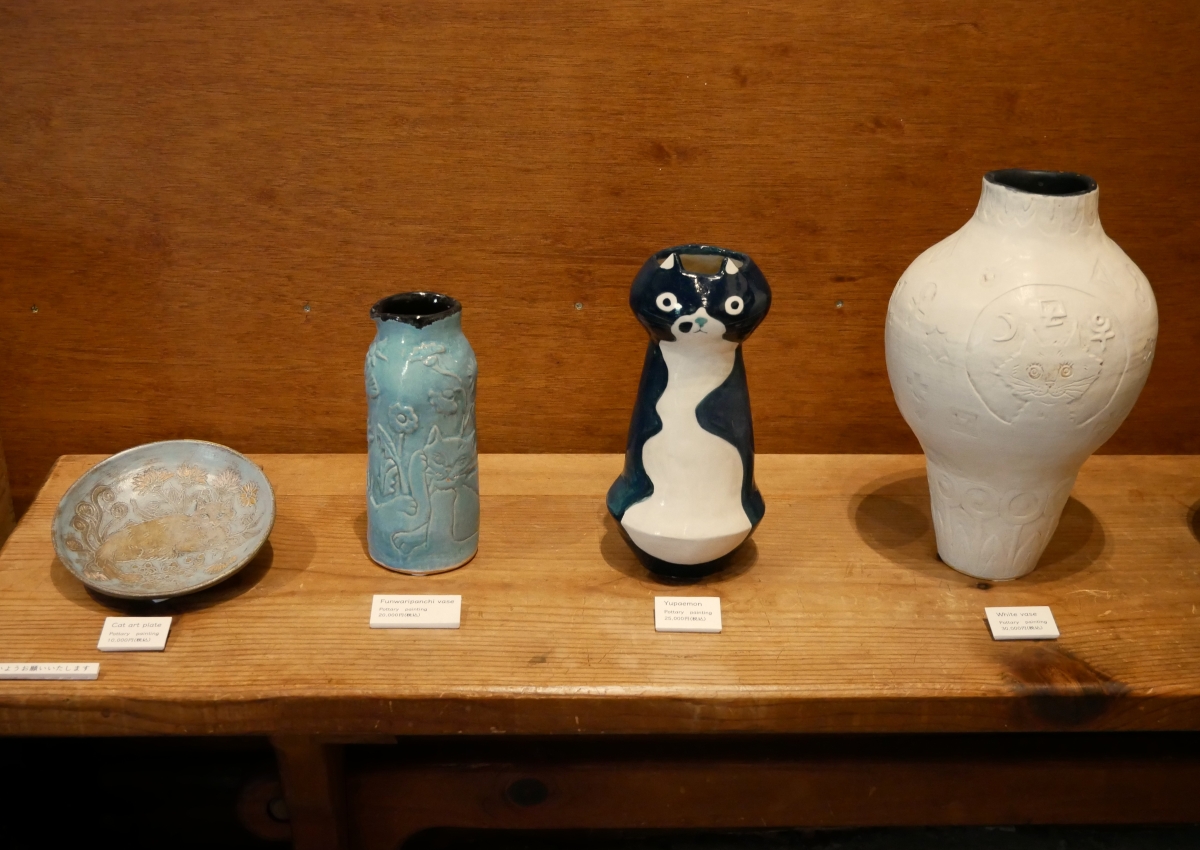 焼き上げたフラワーベースには星座や、星や動物たちが描かれている。期間中、57点の作品を展示し、販売も行う。